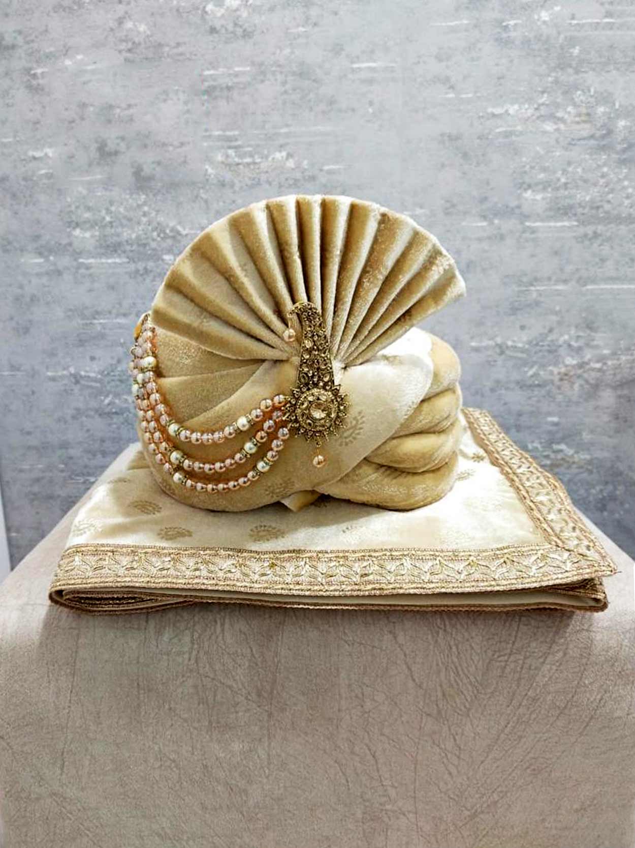 Golden Colour Velvet,Silk Fabric Turban With Lace Work.