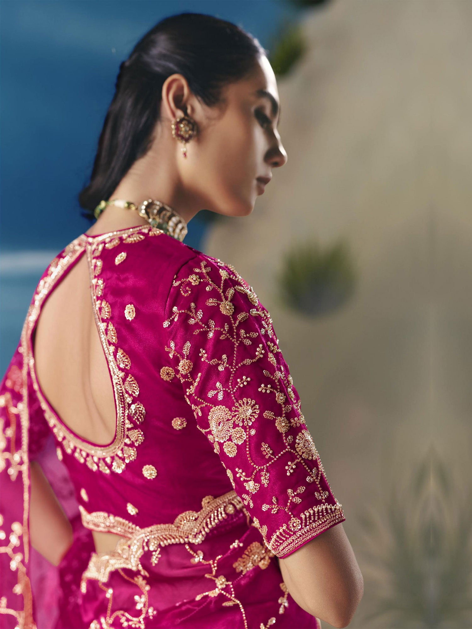 Rani Pink Floral Embroidered Bridal Saree In Organza