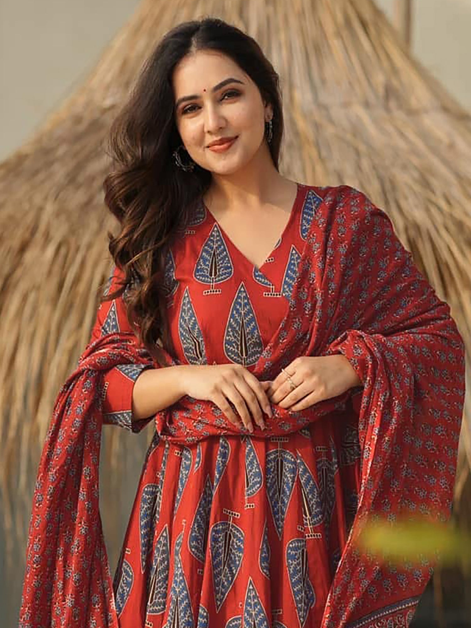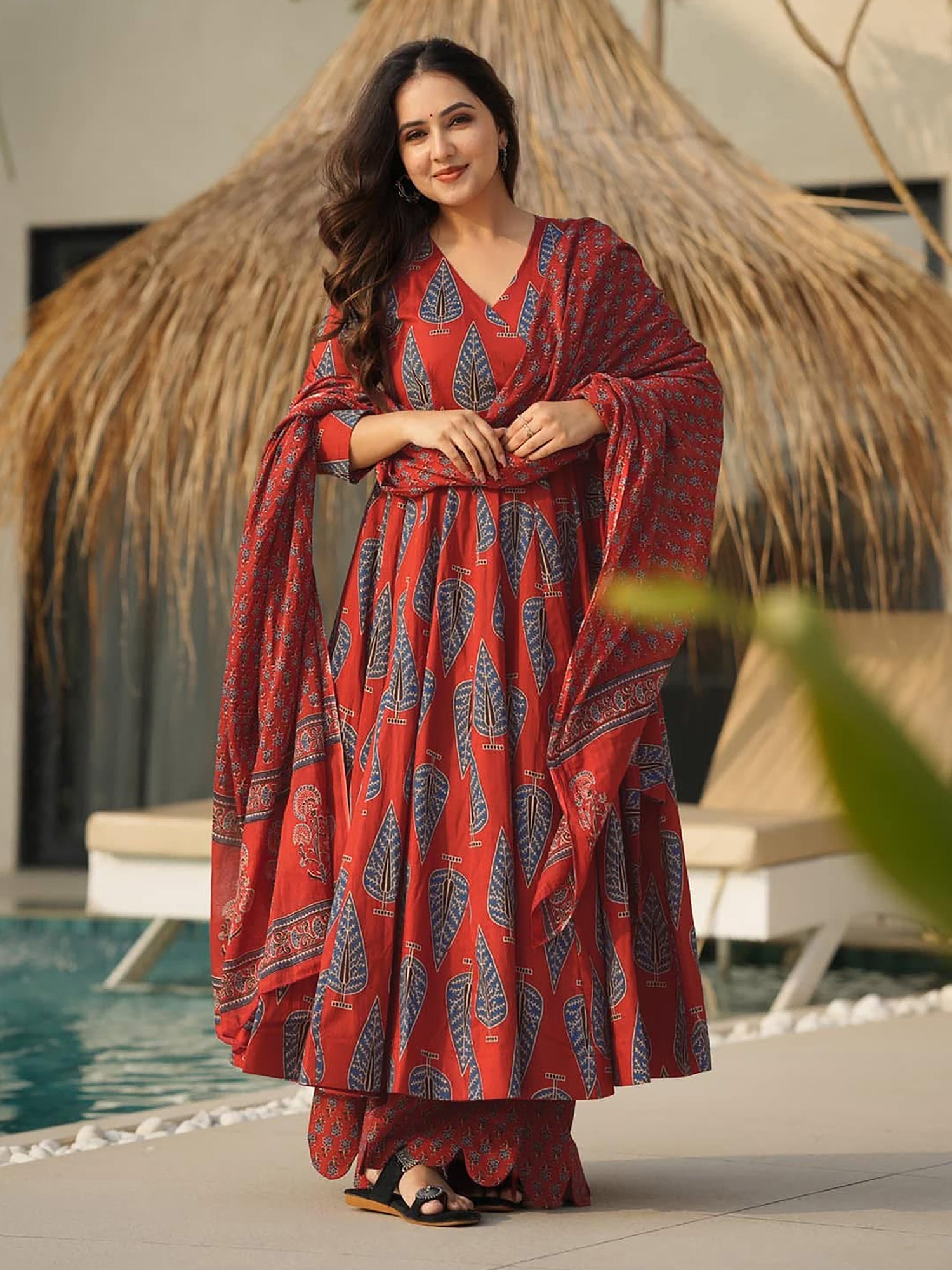 Rust Readymade Palazzo Suit With Dupatta In Print