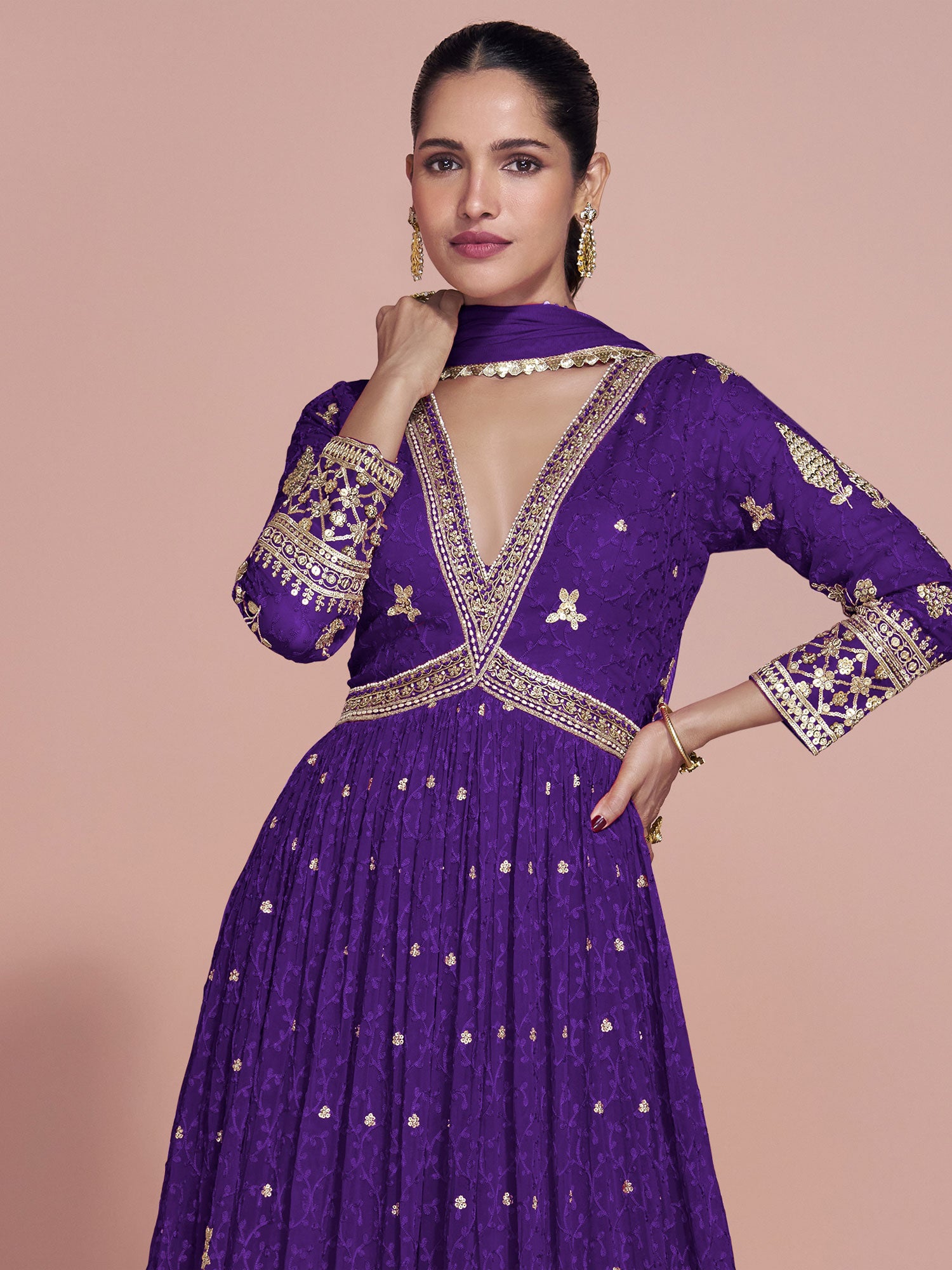 Look no less than a dream wearing this dark purple color anarkali style suit made in real georgette. Enhanced using sequins and floral thread work embellishment with zari work embroidery all over. Comes with a matching purple color dupatta made in real georgette. Note: Accessories shown are for styling purpose only. Slight color variation may occur due to photographic reasons. The semi-stitched kameez can be customised upto 42 inches.