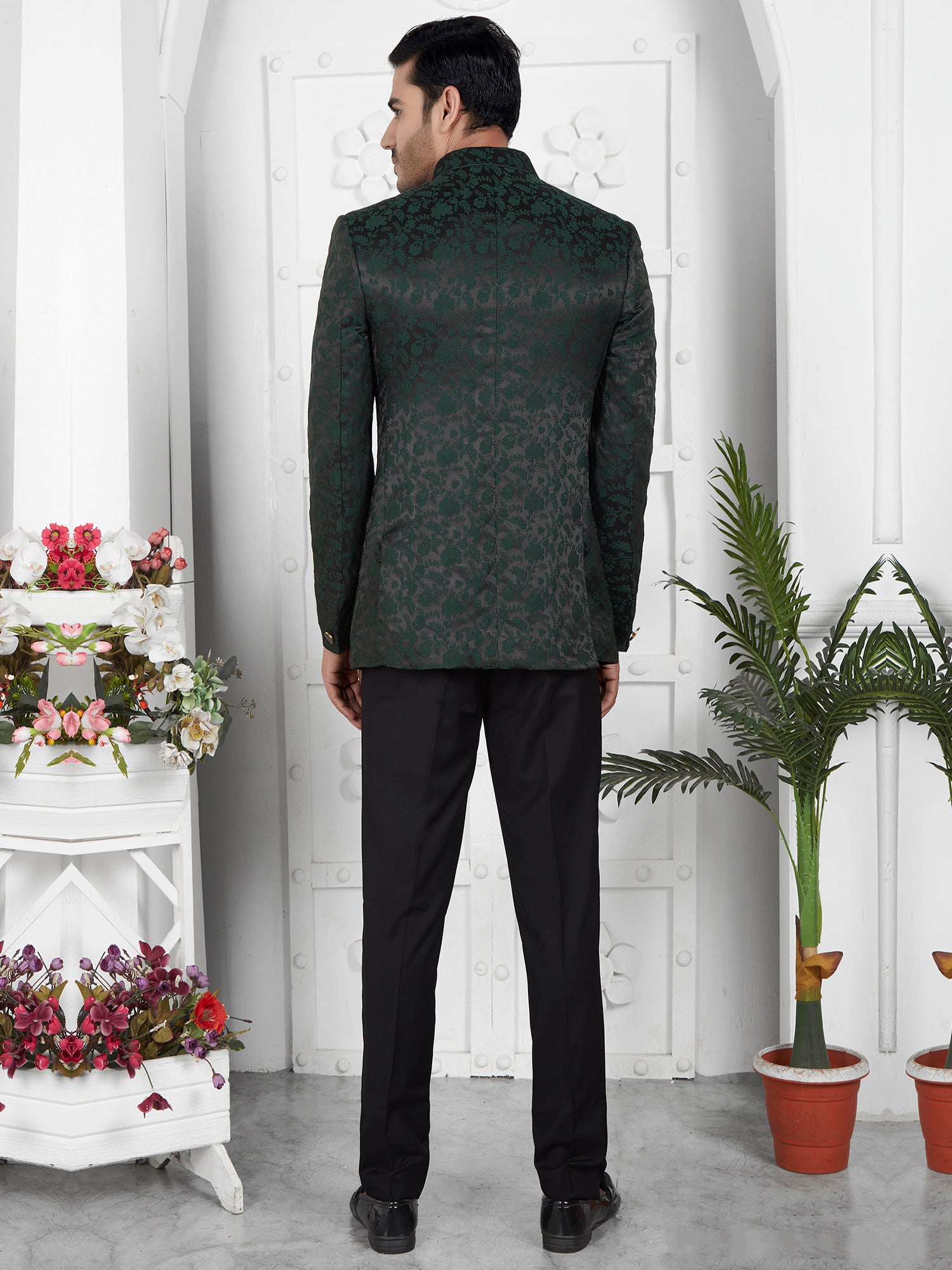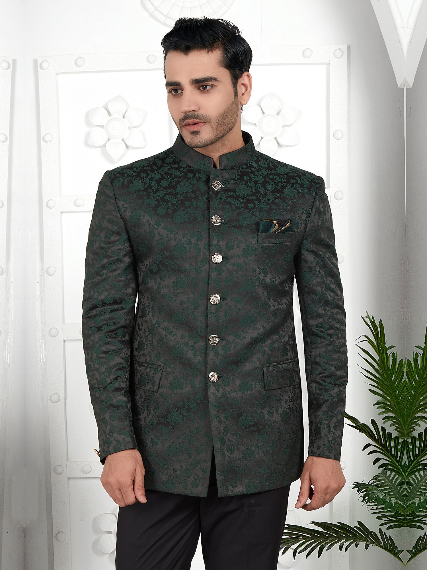 Dark Green Floral Embellished Mens Bandhgala Suit
