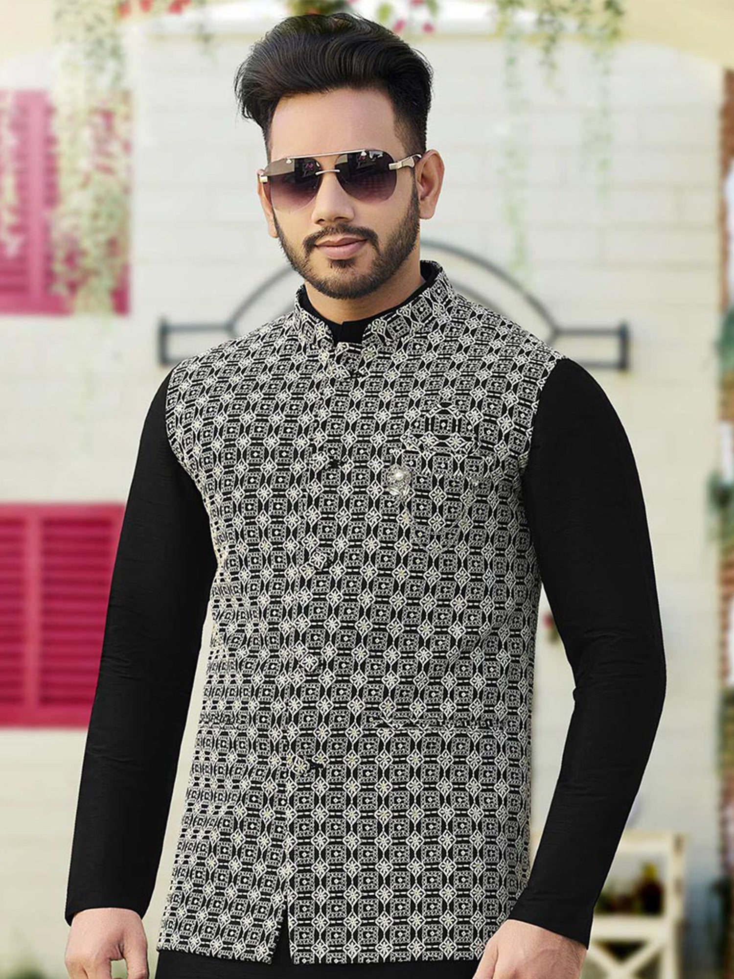 Black Kurta Pyjama With Embroidered Nehru Jacket