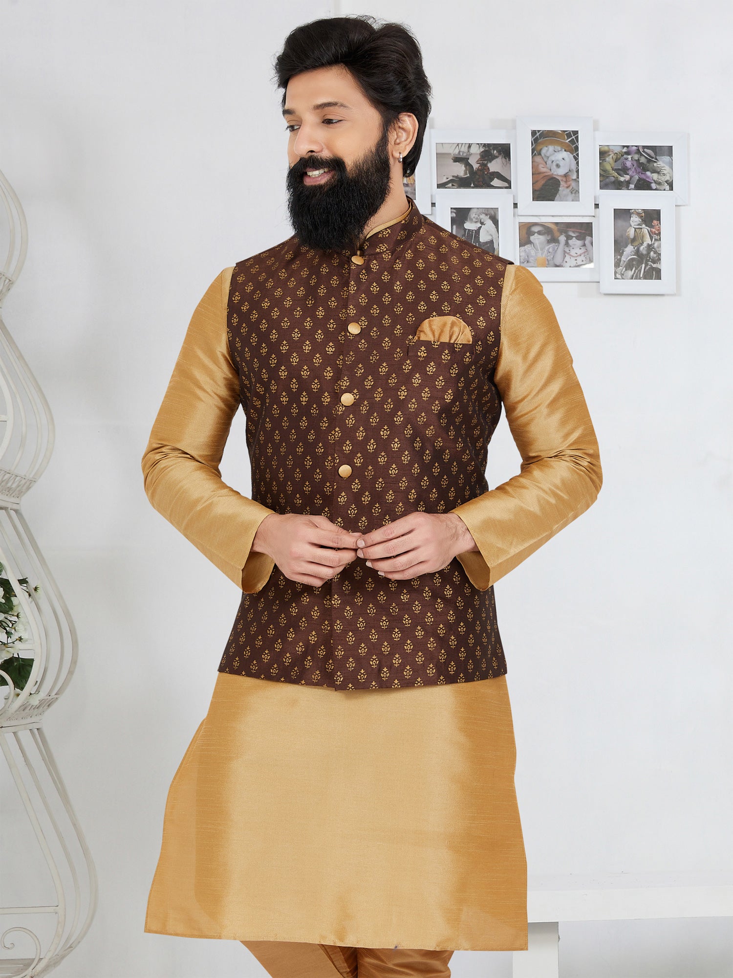 Brown Traditional Woven Pattern Mens Nehru Jacket