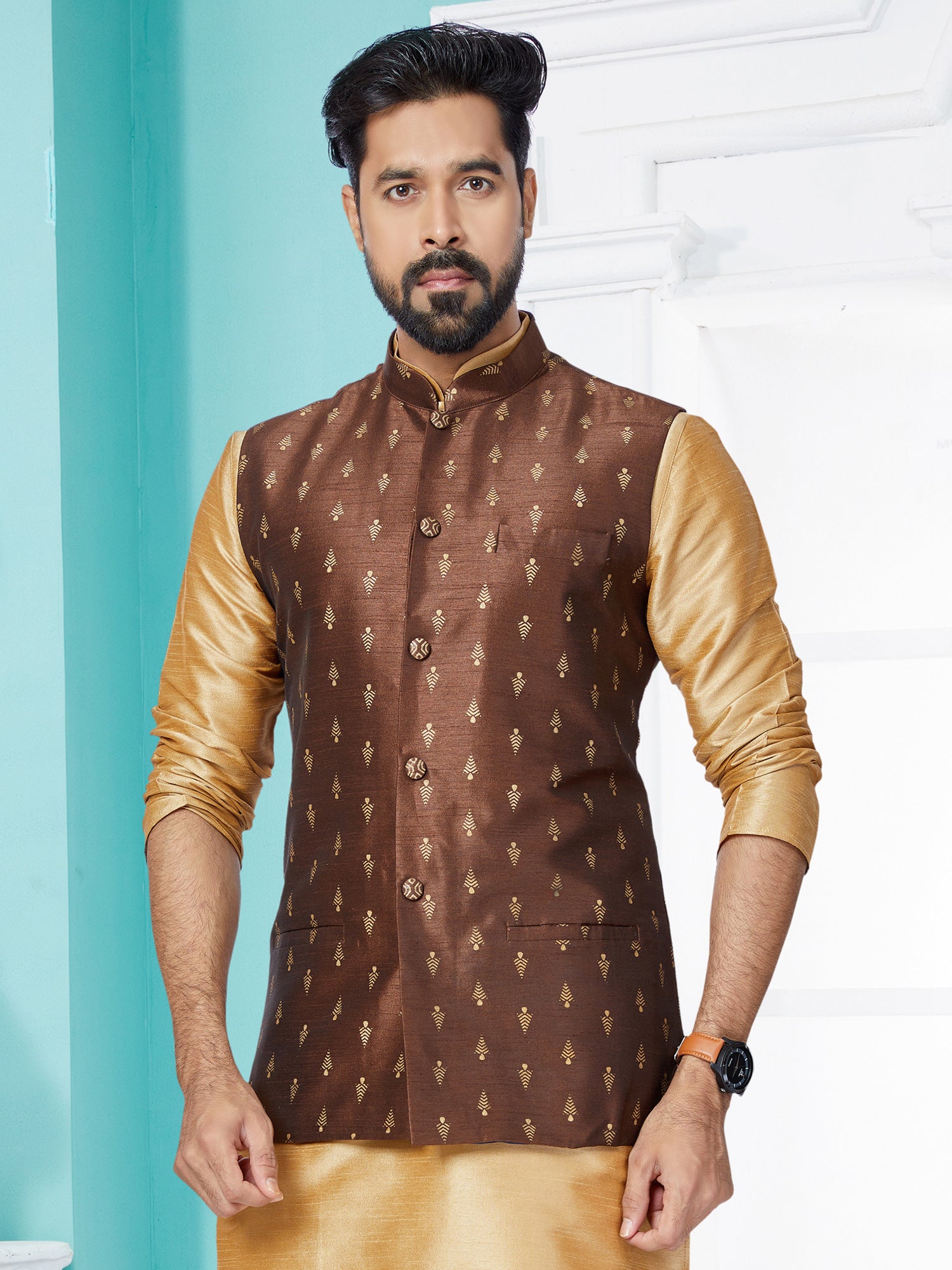 Dark Brown Mens Silk Woven Nehru Jacket
