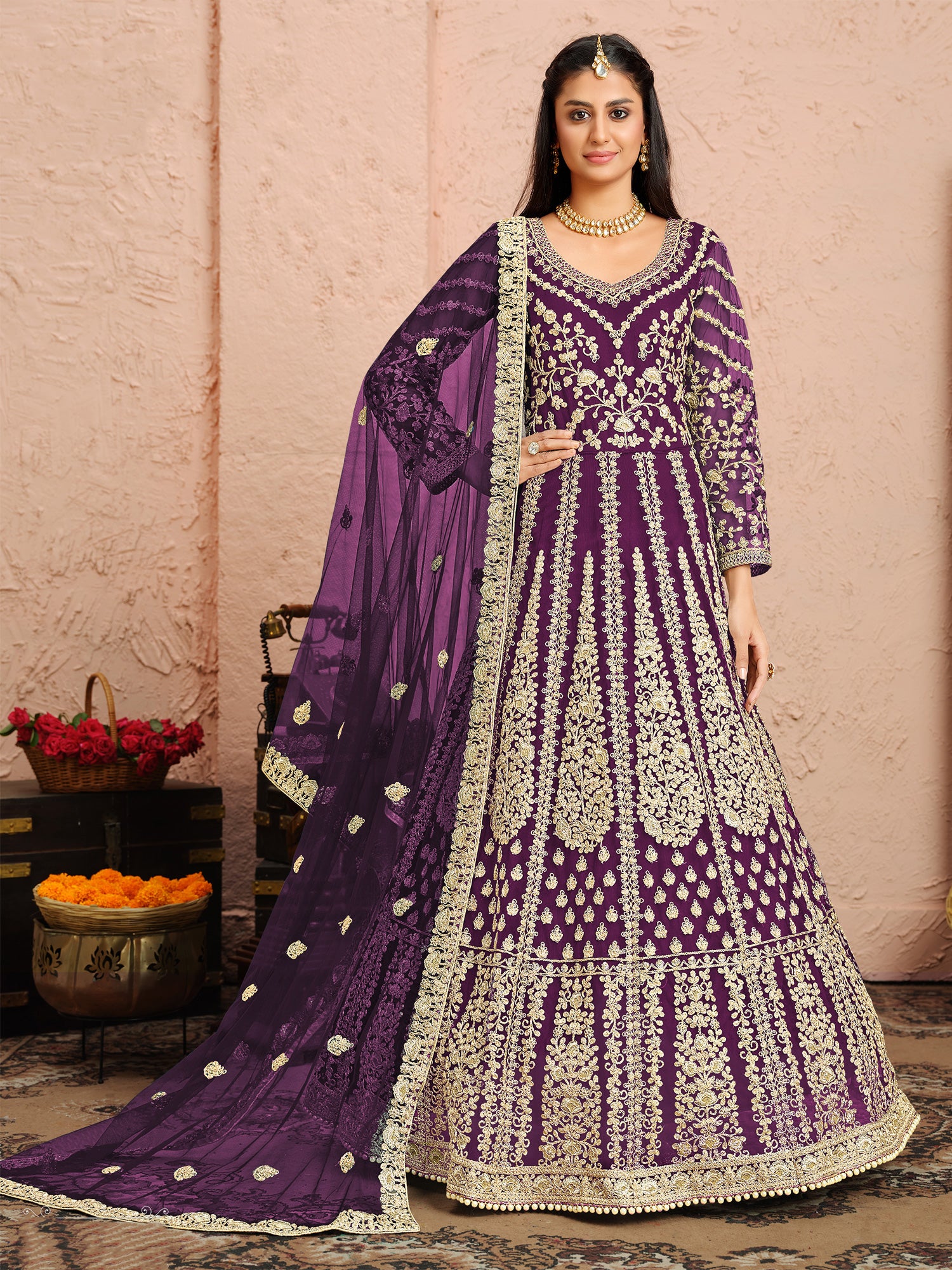Deep Purple Bridal Net Anarkali Salwar Suit In Heavy Zari Embroidery