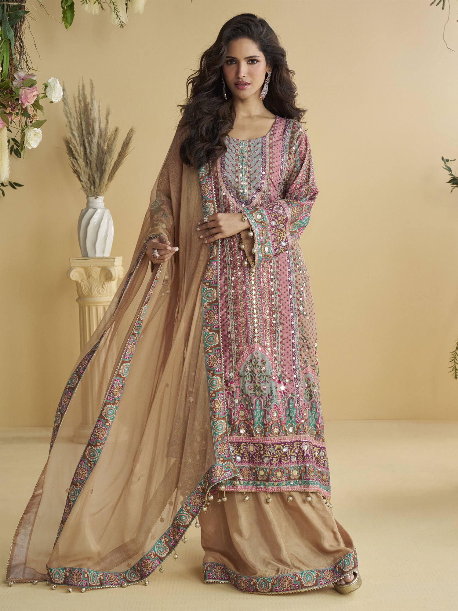 Establish a symbol of style with femininity with this dusty pink color full sleeved readymade straight cut long kameez made in crepe silk. Furnished using sequins, stone work and thread work embellishment with floral printed pattern all over. Available with a beige color sharara style bottom and a beige color dupatta, both made in crepe silk. Note: Accessories shown are for styling purpose only. Slight color variation may occur due to photographic reasons.