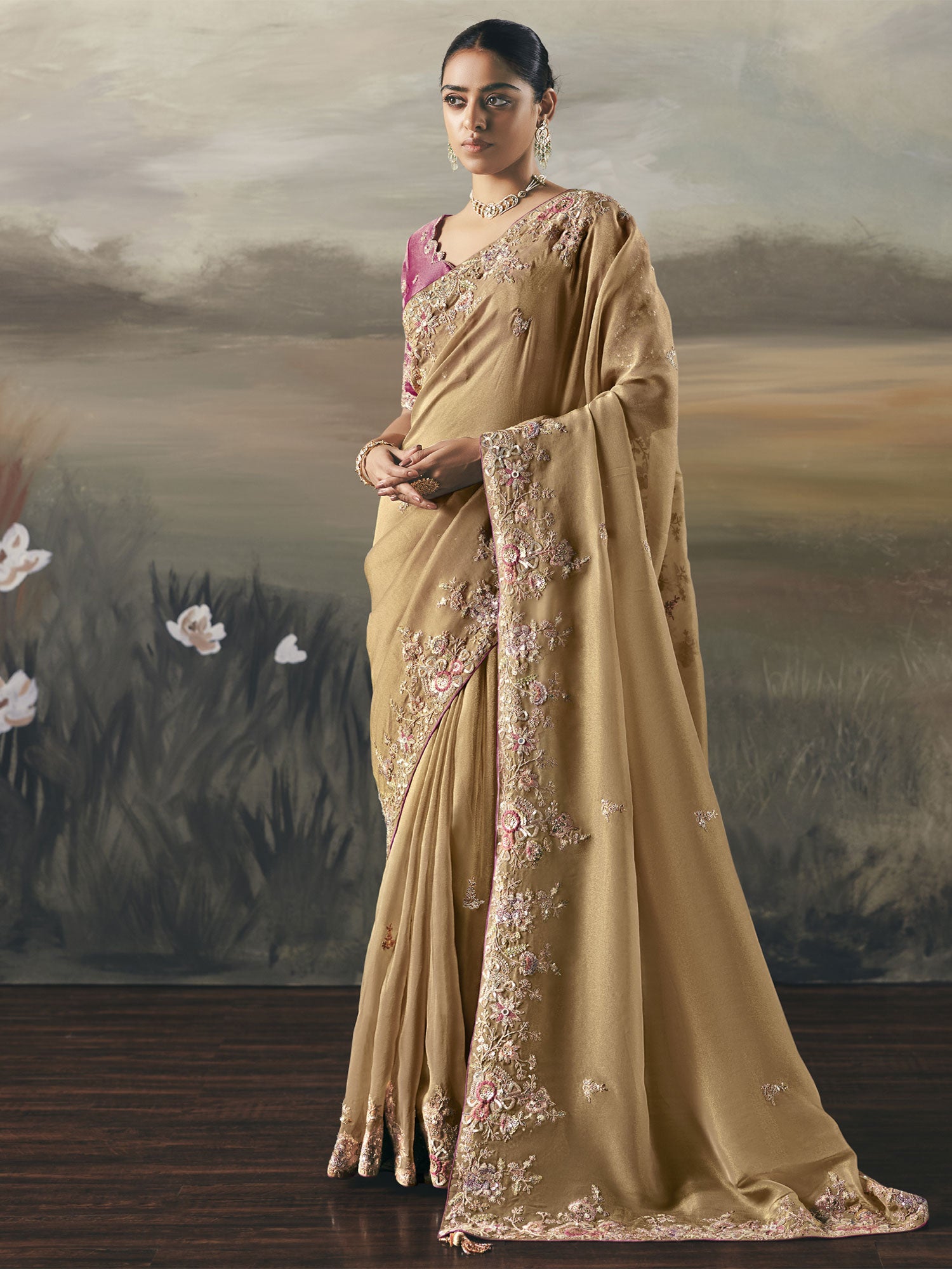 Beige Bridesmaid Saree In Silk With Floral Embroidery