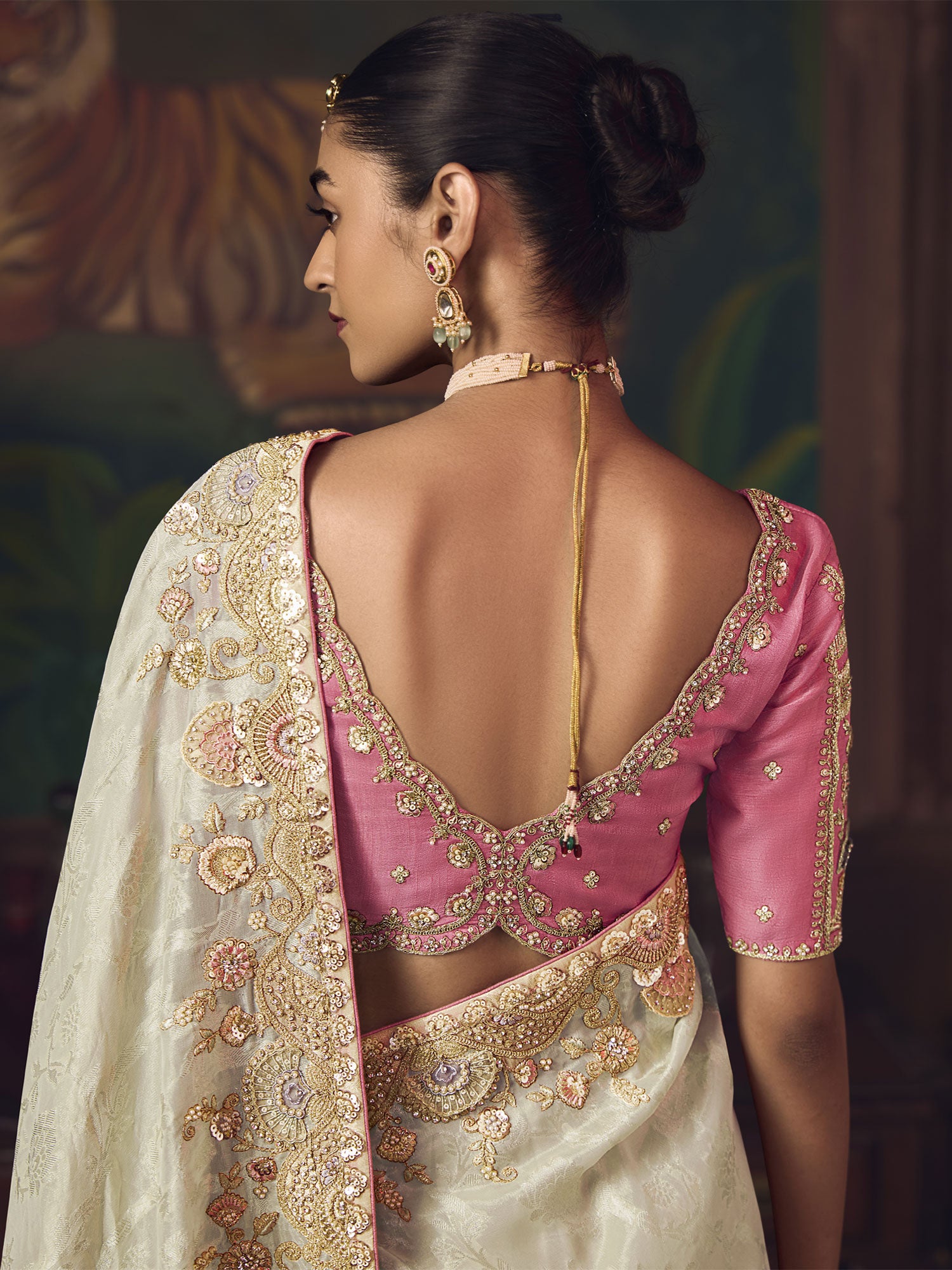 Exuding sheer sophistication in every draped of this beige color saree crafted in silk. Enhanced using sequins, stone work enhanced thread work embellishment with silver zari woven pattern all over, showcasing distinstive embroidered borders and pallu with tassels. Available with a light pink color embroidered blouse in silk. Note: The accessories featured are purely for fashion purposes. Due to photography reasons, some color variations may occur. The un-stitched blouse may be customized up to 42 inches.