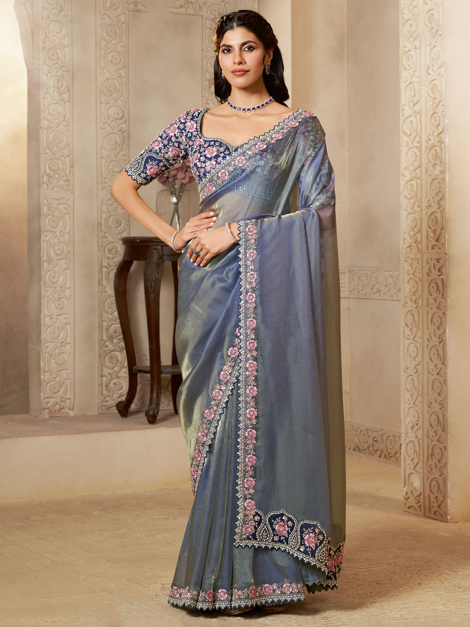Blue Festive Saree In Floral Work With Blouse Blue Festive Saree In Floral Work With Blouse