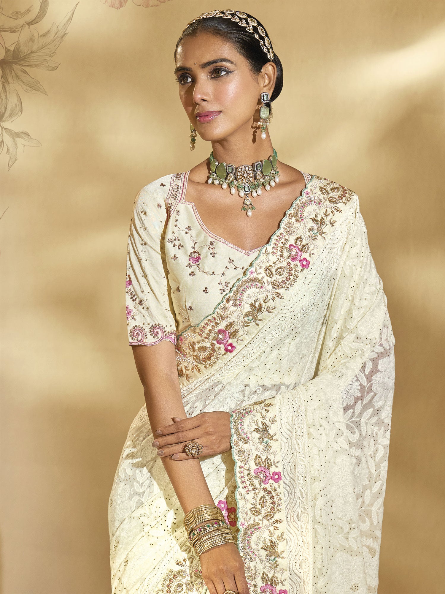 Off White Party Saree In Floral Thread Embroidery