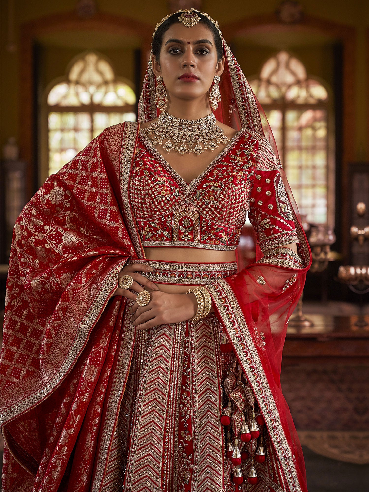 Red Designer Bridal Lehenga Set In Stone Embellishments