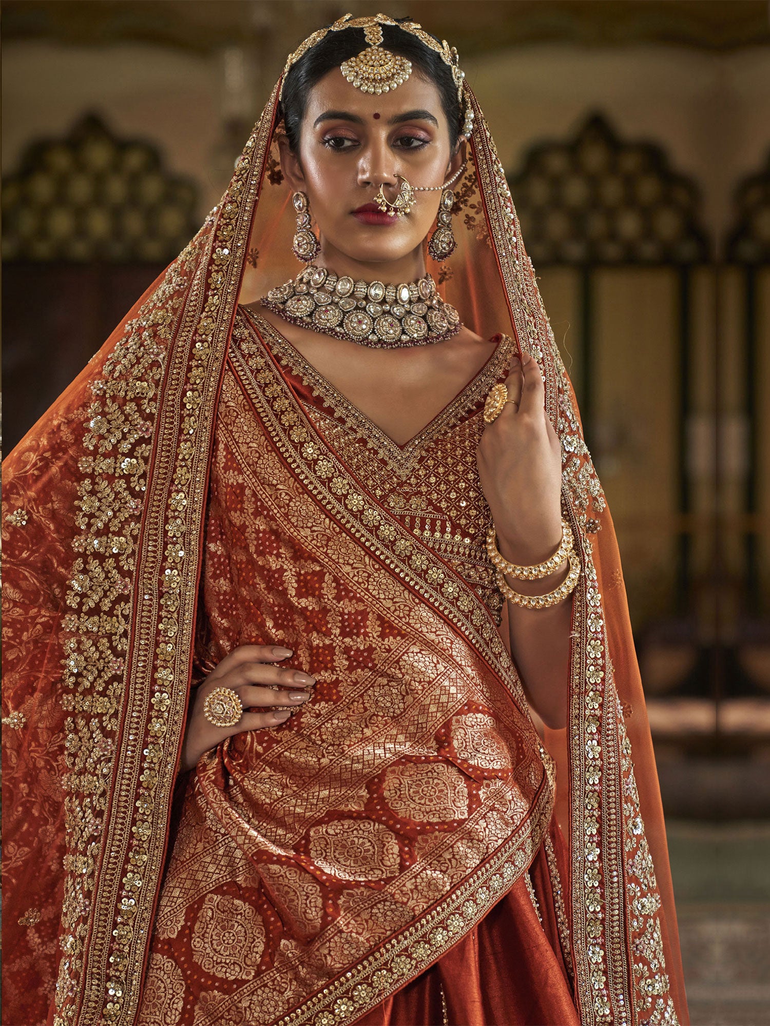 Mirror the sparkle in her eyes wearing this rust color bridal lehenga designed in silk. Crafted with sequins, stone work enhanced and heavy thread embroidered work with heavy zari embellishment all over. Paired with a matching rust color heavy embroidered choli in silk and a banarasi silk woven dupatta and a net dupatta, both made in rust color. Note: The accessories featured are purely for fashion purposes. Due to photography reasons, some color variations may occur. The semi-stitched choli and lehenga waist may be customized up to 42 inches.