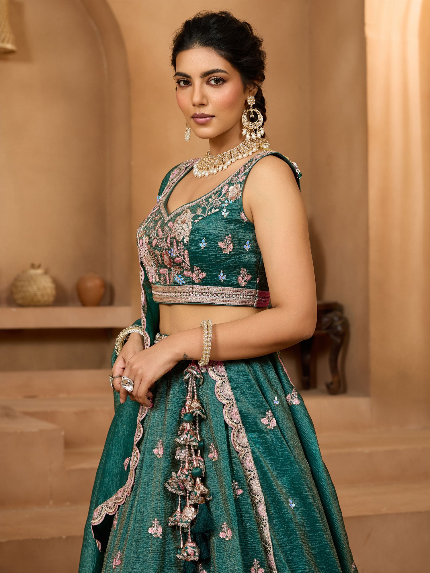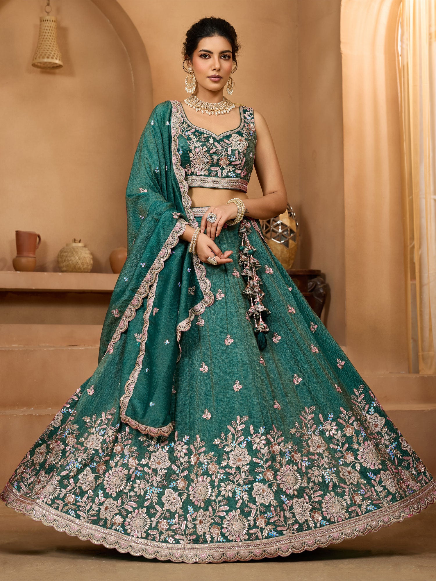 Teal Green Thread Work Embroidered Silk Lehenga Set