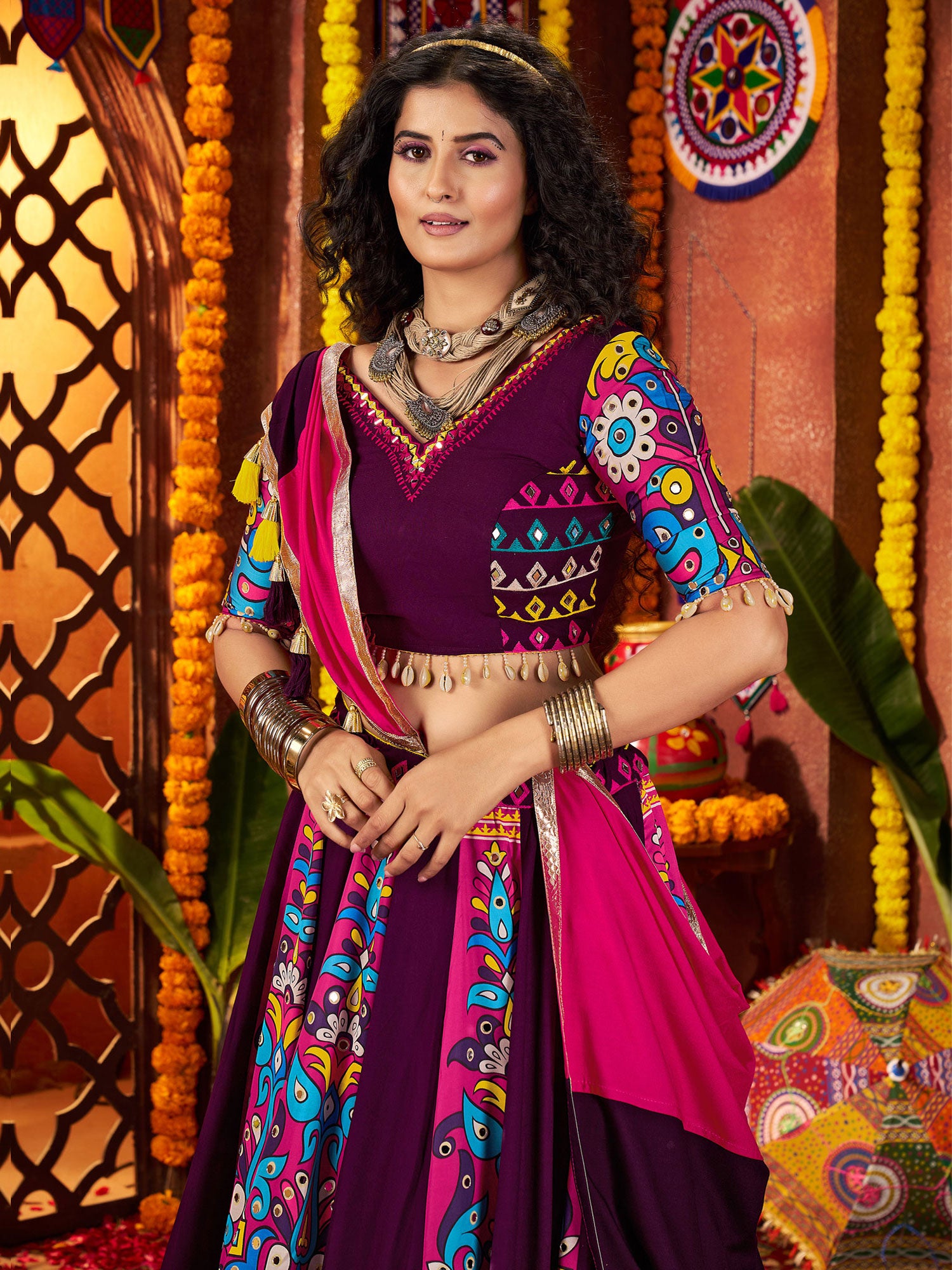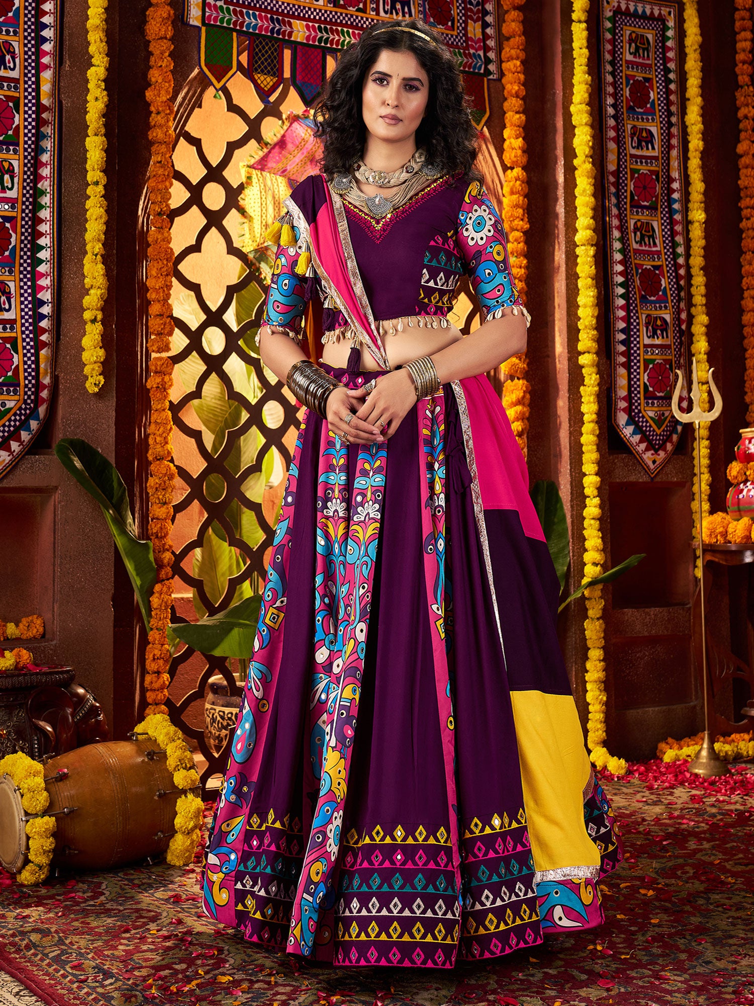 Wine Thread Augmented Cotton Lehenga Set