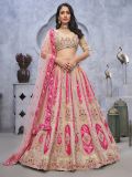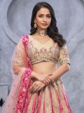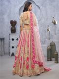 Overwhelm the audience as you wear this beige and pink color bridesmaid lehenga in organza silk. Enhanced using sequins, stone work and zari embroidery with heavy thread embellishment all over. Comes with a matching beige color embroidered choli in silk and a pink color dupatta, made in soft net. Note: The accessories featured are purely for fashion purposes. Due to photography reasons, some color variations may occur. The semi-stitched choli and lehenga waist may be customized up to 42 inches.