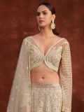 Embrace everyday elegance as you wear this beige color bridesmaid lehenga designed in heavy net. Designed with sequins, stone work enhanced and zari embellishment with heavy floral thread work embroidery all over. Available with a matching beige color embroidered choli and a beige color dupatta, both made in net. Note: The accessories featured are purely for fashion purposes. Due to photography reasons, some color variations may occur. The semi-stitched choli and lehenga waist may be customized up to 42 inches.