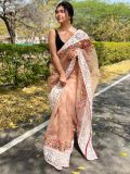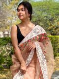 Evoke the fashionista in you wearing this beige color saree crafted in organza. Augmented using floral prints, showcasing distinstive borders enhanced with thread work. Comes with a matching beige color blouse in organza. Note: The accessories featured are purely for fashion purposes. Due to photography reasons, some color variations may occur. The un-stitched blouse may be customized up to 42 inches.