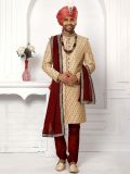 Look all traditional wearing this beige color sherwani made in art silk. Crafted using zari, sequins embroidery with stones embellishment work. Teamed with maroon color churidaar in dupion silk and a maroon embroidered stole. Note: Some color variations may occur owing to photography causes. Up to 1 inch of measurement fluctuation is possible.