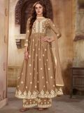 Exhibiting this beige color anarkali style kameez in georgette. Designed using thread embroidery all over. Comes with a matching chiffon dupatta and a palazzo in georgette. Note: Accessories shown are for styling purpose only. Slight color variation may occur due to photographic reasons. The semi-stitched kameez can be customised upto 42 inches.