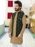 Get a sleak festive look with this beige color kurta made in jacquard. Paired with an embroidered green nehru jacket made in jacquard. Available with a white color trouser pants in cotton. Note: Some color variations may occur owing to photography causes. Up to 1 inch of measurement fluctuation is possible.