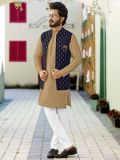 Look dapper adorning this beige color kurta made in jacquard. Topped with a printed indigo blue nehru jacket made in jacquard. Paired with a white color trouser pants in cotton. Note: Some color variations may occur owing to photography causes. Up to 1 inch of measurement fluctuation is possible.