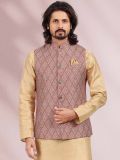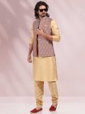 Look all stylish as you wear this beige color kurta made in art silk. Paired with a maroon color printed nehru jacket made in banarasi silk and beige color churidaar in art silk. Note: Some color variations may occur owing to photography causes. Up to 1 inch of measurement fluctuation is possible.