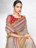 Exude major regal vibes adorning this lush beige color saree crafted in organza. Furnished using mirror work and thread embroidered patterns, showcasing distinstive borders and pallu. Assembled with a red color embroidered blouse in art silk. Note: The accessories featured are purely for fashion purposes. Due to photography reasons, some color variations may occur. The un-stitched blouse may be customized up to 42 inches.