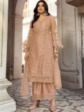 Look mesmerisingly elegant sporting this beige color straight cut kameez in net. Designed using fine thread work embroidery with stones all over. Comes with a matching net dupatta and a matching palazzo in net with satin linings. Note: Accessories shown are for styling purpose only. Slight color variation may occur due to photographic reasons. The semi-stitched kameez can be customised upto 42 inches.