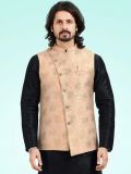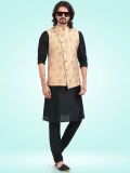 Grab all the attention adorning this black color kurta made in art silk. Styled using jacquard woven banarasi silk jacket in beige shade. Available with matching black color churidaar in art silk. Note: Some color variations may occur owing to photography causes. Up to 1 inch of measurement fluctuation is possible.