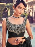 Make a classy statement adorning this black color saree crafted in georgette. Augmented using ruffle patterns. Paired with a matching black color organza blouse enhanced with mirror and dori embroidered work. Note: The accessories featured are purely for fashion purposes. Due to photography reasons, some color variations may occur. The un-stitched blouse may be customized up to 42 inches.