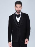 Take your fashion game one level higher by adorning this black color tuxedo suit set designed in polyster cotton. Augmented with hand work and floral thread work embellishments. The tuxedo contains blazer coat paired with the waist coat, bow or a inside white color shirt and a pant in matching black color. Note: Some color variations may occur owing to photography causes. Up to 1 inch of measurement fluctuation is possible.