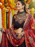Steal the limelight adorning this stylish black hued festive lehenga choli crafted in cotton. Drenched in abstract prints all over. Comes along with a black color thread and mirror embroidered cotton choli and a red dupatta made of cotton. Please keep in mind that the accessories featured are purely for fashion purposes. Due to photography reasons, some color variations may occur. The semi-stitched choli and lehenga waist may be customized up to 42 inches.