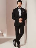 Shine like a diamond adorning this black color tuxedo made in italian fabric. Crafted with thread embroidery and hand work all over. Teamed with a white cotton shirt, bow tie and a matching black trousers. Note: Some color variations may occur owing to photography causes. Up to 1 inch of measurement fluctuation is possible.