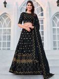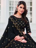 Upgrade your styling game with this black color lehenga in georgette. Elevated with sequins and thread embroidered work. Comes with a matching black color embroidered choli and black dupatta, both made in georgette. Note: The accessories featured are purely for fashion purposes. Due to photography reasons, some color variations may occur. The semi-stitched choli and lehenga waist may be customized up to 42 inches.