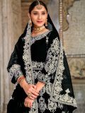 Create a dreamy ethnic look with this black color slitted anarkali kameez in velvet. Decorated using zari and thread work embroidery with stones all over. Comes with a matching net dupatta and a matching bottom in net. Note: Accessories shown are for styling purpose only. Slight color variation may occur due to photographic reasons. The semi-stitched kameez can be customised upto 42 inches.