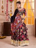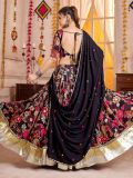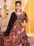 Addressing the Glamour while having this black color festive lehenga made in viscose cotton. Enhanced with mirror work enhanced and thread embroidered work with floral printed pattern all over. Paired with a matching black color embroidered choli and a black color dupatta, both made in viscose cotton. Note: The accessories featured are purely for fashion purposes. Due to photography reasons, some color variations may occur. The semi-stitched choli and lehenga waist may be customized up to 42 inches.