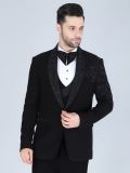 Renew your style statement adorning with this black color tuxedo suit set designed in polyster cotton. Designed with cut dana work and floral thread work embellishments. The tuxedo contains blazer coat paired with the waist coat, bow or a inside white color shirt and a pant in matching black color. Note: Some color variations may occur owing to photography causes. Up to 1 inch of measurement fluctuation is possible.