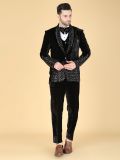 Seamlessly combines traditional charm and elegance with this black color tuxedo suit set designed in velvet. Furnished with cut dana work and hand work embellishments all over. The tuxedo contains blazer coat paired with the waist coat, bow or a inside white color shirt and a pant in matching black color. Note: Some color variations may occur owing to photography causes. Up to 1 inch of measurement fluctuation is possible.