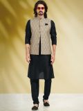 Exude regal vibes as you wear this black color kurta made in art silk. Paired with a brown color printed nehru jacket made in banarasi silk and black color churidaar in art silk. Note: Some color variations may occur owing to photography causes. Up to 1 inch of measurement fluctuation is possible.