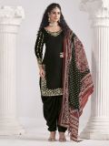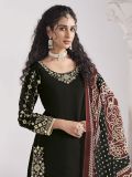 Show your feminine side to the world wearing this black color straight cut kameez made in roman silk. Augmented using sequins and mirror work embellishment with floral zari embroidery all over over. Comes with a matching black color punjabi style bottom in santoon fabric and a black color bandhani printed dupatta made in chanderi silk. Note: Accessories shown are for styling purpose only. Slight color variation may occur due to photographic reasons. The semi-stitched kameez can be customised upto 42 inches.