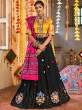 Take your festive look to a notch higher adorning this black hued festive lehenga in cotton. Crafted with sparkly mirror work and thread embroidery, creating a dramatic look. Paired along with a contrast matching yellow color choli in art silk and a pink colored cotton dupatta, both embroidered with similar work. Please keep in mind that the accessories featured are purely for fashion purposes. Due to photography reasons, some color variations may occur. The semi-stitched choli and lehenga waist may be customized up to 42 inches.