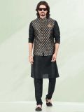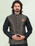 Walk in style adorning this black color kurta made in art silk. Styled using a black color nehru jacket in banarsi silk ehanced with woven details all over. Comes with matching black color churidar pants in art silk. Note: Some color variations may occur owing to photography causes. Up to 1 inch of measurement fluctuation is possible.
