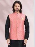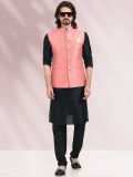 Set major ethnic goals with this black color kurta made in art silk. Styled using a peach color nehru jacket in banarsi silk ehanced with woven details all over. Comes with matching black color churidar pants in art silk. Note: Some color variations may occur owing to photography causes. Up to 1 inch of measurement fluctuation is possible.