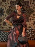 Gear up your party look adorning this black color saree crafted in silk. Decorated using zari woven patterns, showcasing distinstive tasseled pallu. Teamed with a matching black color blouse in silk. Note: The accessories featured are purely for fashion purposes. Due to photography reasons, some color variations may occur. The un-stitched blouse may be customized up to 42 inches.