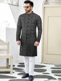 Showcasing this black grey color full sleeved kurta made in jacquard. Styles with dense printed details. Available with white color trousers in silk. Note: Some color variations may occur owing to photography causes. Up to 1 inch of measurement fluctuation is possible.