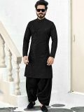 Get a glamorous look adorning this black color full sleeved kurta made in jacquard. Elevated with sequins embroidered work details. Paired with black color pathani salwar in silk. Note: Some color variations may occur owing to photography causes. Up to 1 inch of measurement fluctuation is possible.