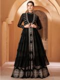 Evoke the fashionista in you adorning this black color jacket style anarkali kameez made in georgette. Decorated using sequins and thread work embroidery all over. Paired with a matching georgette dupatta and a matching bottom in crepe. Note: Accessories shown are for styling purpose only. Slight color variation may occur due to photographic reasons. The semi-stitched kameez can be customised upto 42 inches.