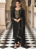 Slay with your distinct style sporting this black color straight cut kameez in georgette. Enriched using sequins, stones and thread embroidery all over. Teamed with a matching georgette dupatta and a matching shantoon pants. Note: Accessories shown are for styling purpose only. Slight color variation may occur due to photographic reasons. The semi-stitched kameez can be customised upto 42 inches.