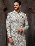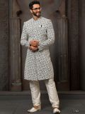 Walk in regalia adorning this black color sherwani made in art silk. Designed using thread embroidery with sequins work. As shown it comes with an white color churidaar in dupion silk. Note: Some color variations may occur owing to photography causes. Up to 1 inch of measurement fluctuation is possible.