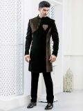Black readymade indo western sherwani in velvet designed with Different cut enhanced by front motif in zardozi & zari.Suitable for Indian Weddings, Bollywood parties and Indian Ceremonies, Perfect for Groom or Groomsmen